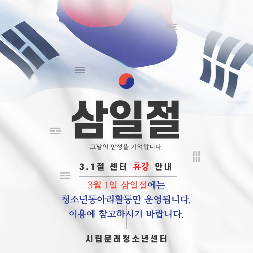 [시립문래청소년센터] 3월 1일 금요일 삼일절 센터 휴강 안내드립니다.